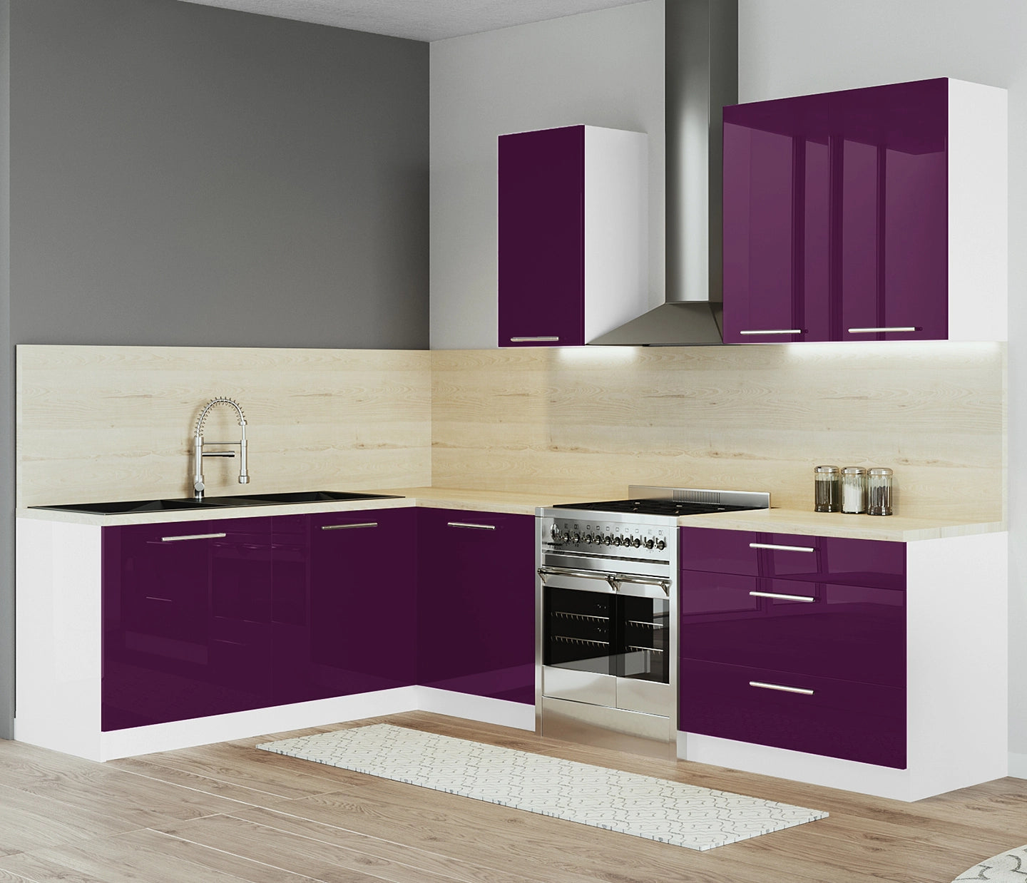 Cuisine complète d'angle 260cm 6 meubles, façade laquée Aubergine, Poignées inox et pieds fournis