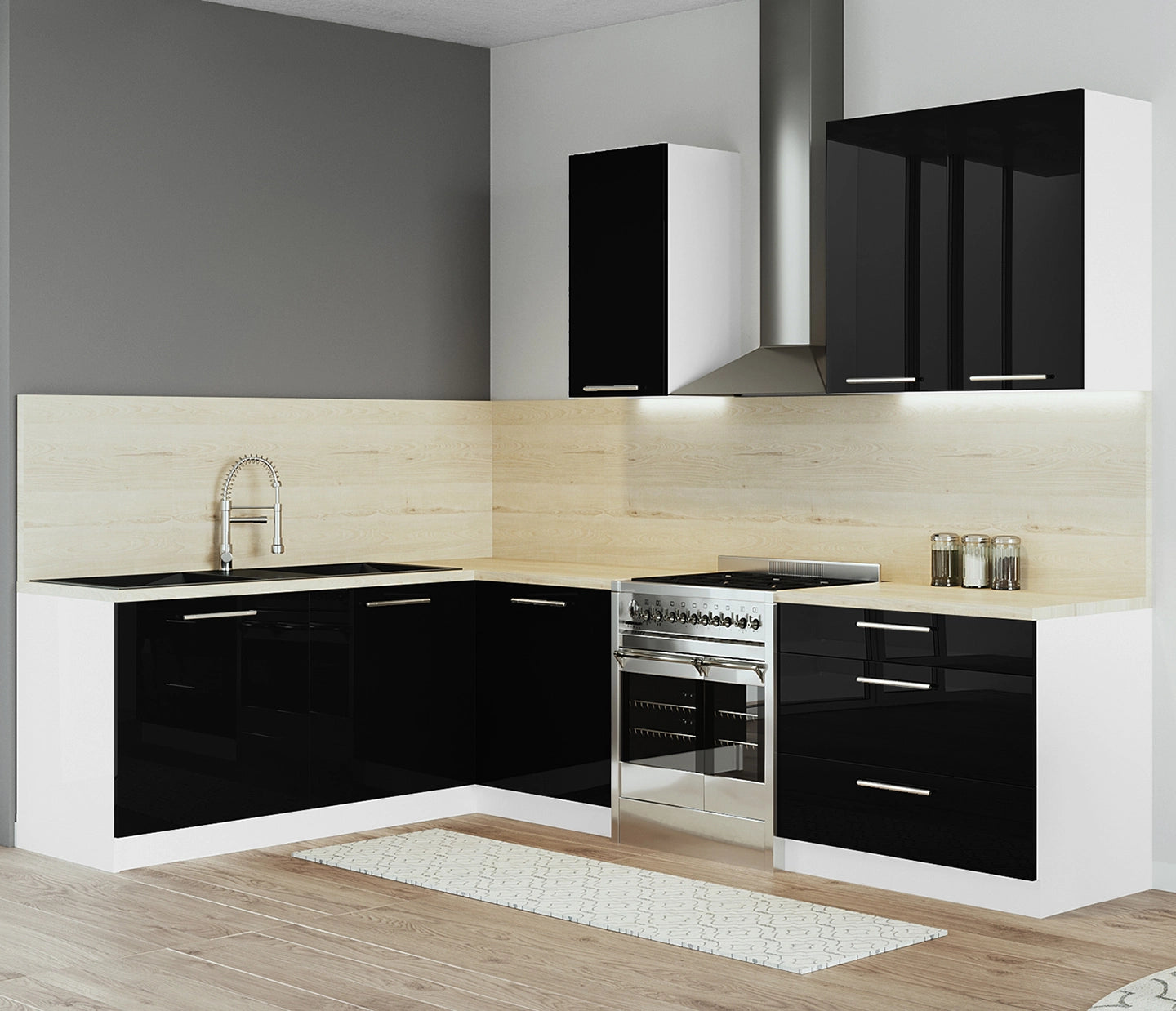 Cuisine complète d'angle 260cm 6 meubles, façade laquée Noire, Poignées inox et pieds fournis