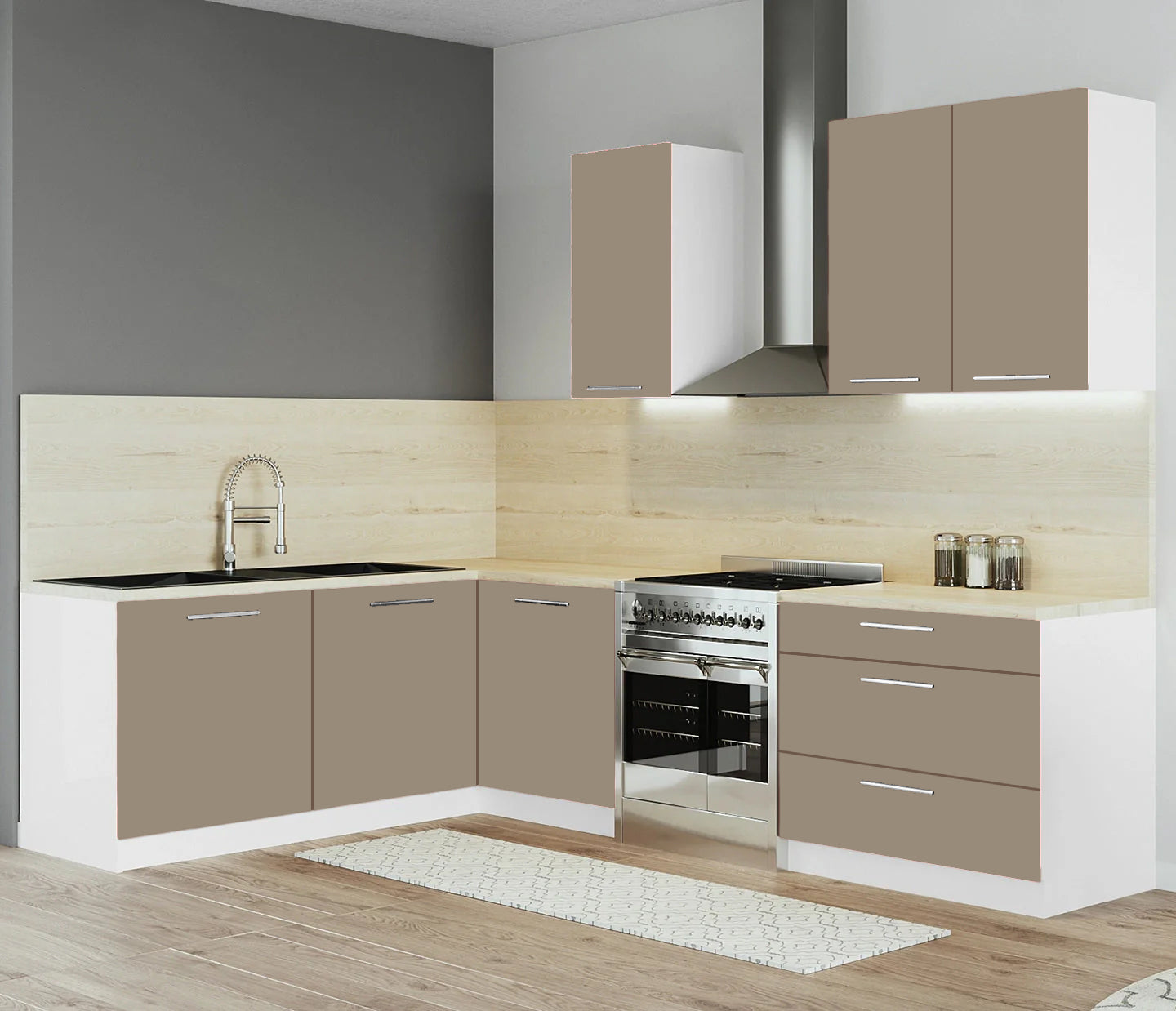 Apportez une ambiance moderne à votre cuisine grâce à cette configuration d’angle de 260 cm, composée de 6 meubles modulables en finition sable mat avec poignées inox brossé et pieds réglables.