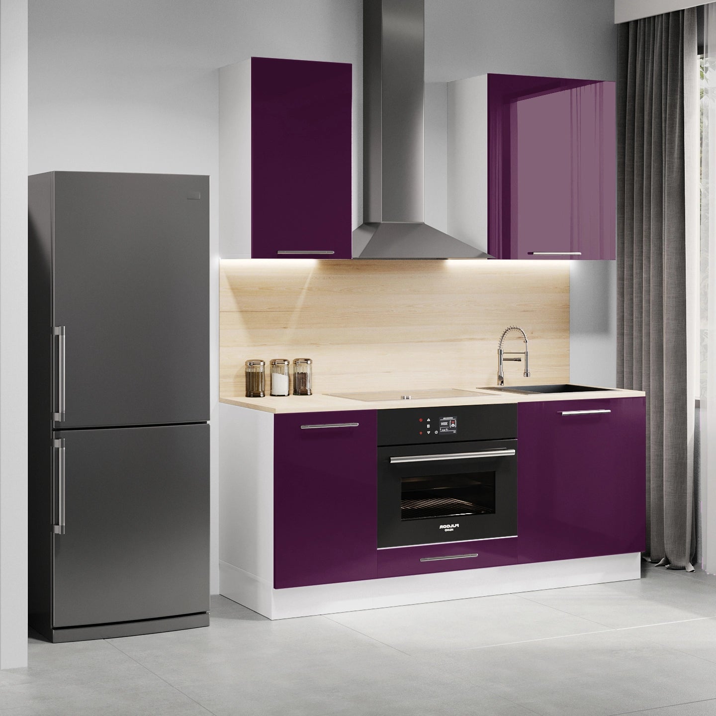 Cuisine complète haut et bas 160cm 5 meubles dont sous évier et bas four, façade laquée Aubergine, Poignées inox et pieds fournis
