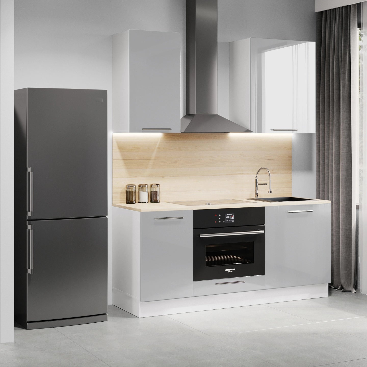 Cuisine complète haut et bas 160cm 5 meubles dont sous évier et bas four, façade laquée Gris, Poignées inox et pieds fournis