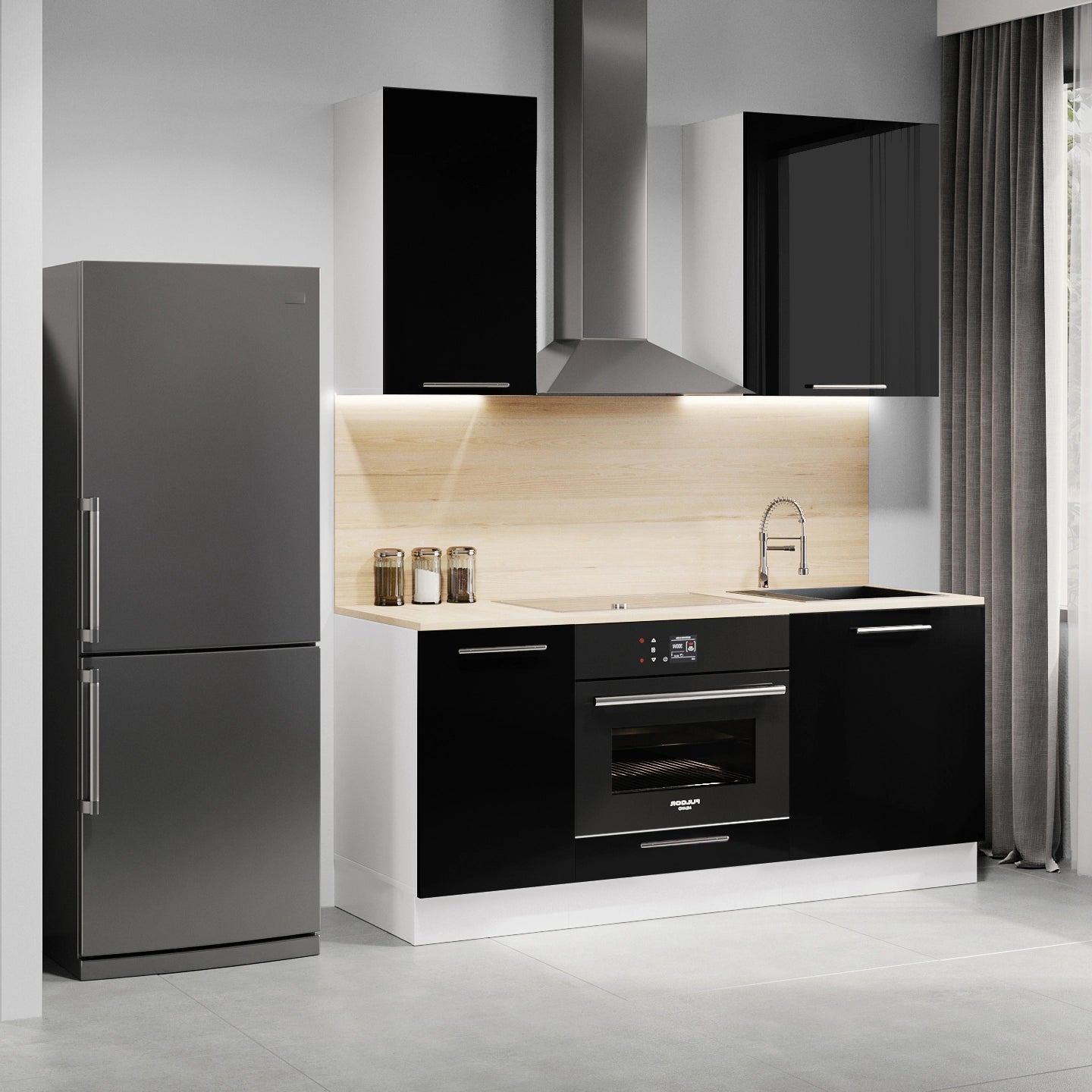 Cuisine complète haut et bas 160cm 5 meubles dont sous évier et bas four, façade laquée Noire, Poignées inox et pieds fournis
