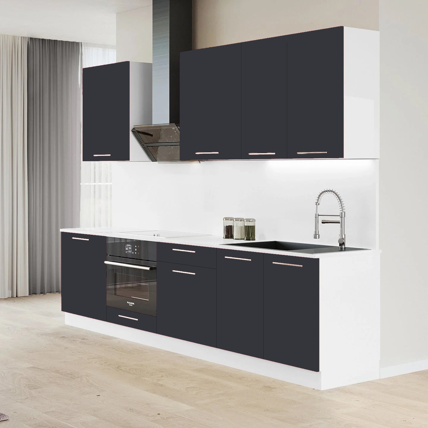 Optimisez votre espace avec cette cuisine complète gris anthracite de 2,6 m, comprenant 7 meubles fonctionnels : 3 hauts et 4 bas, dont meuble sous évier et meuble bas four.