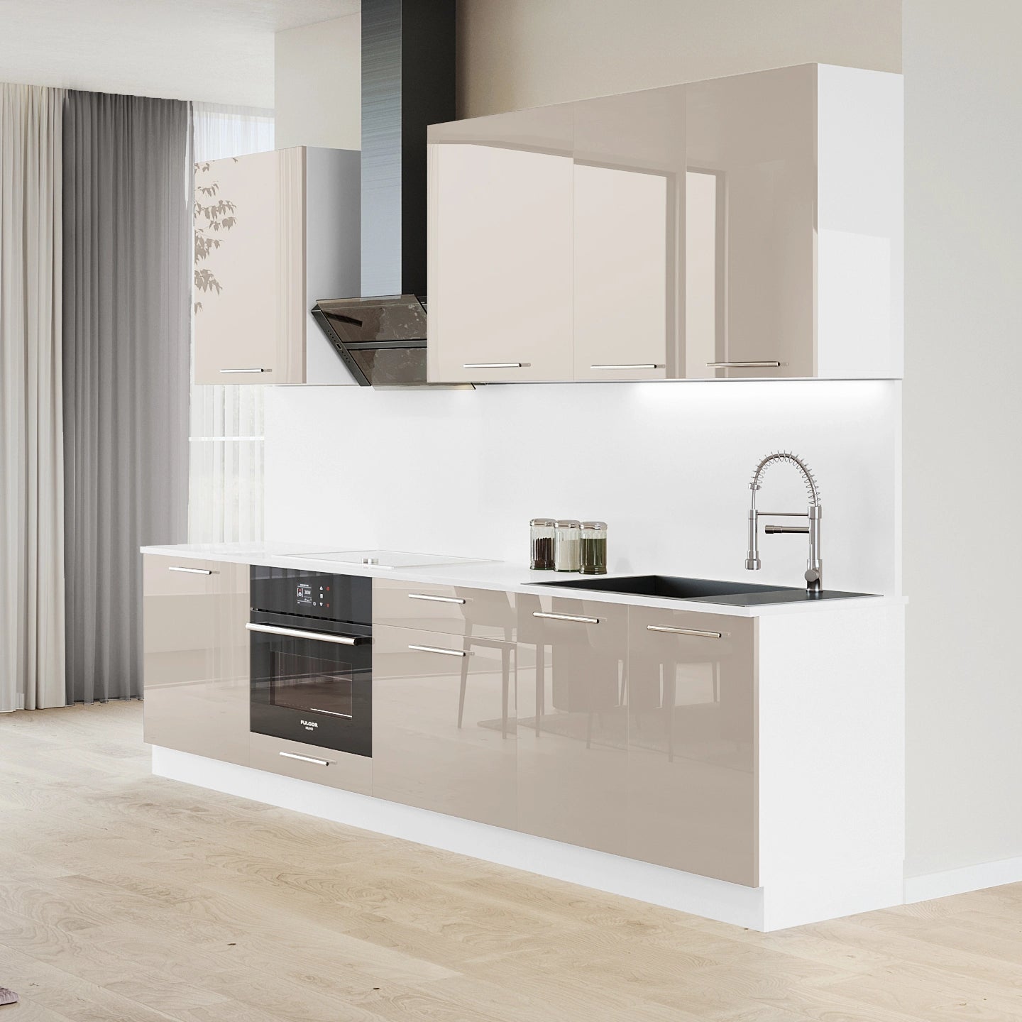 Cuisine complète haut et bas 260cm 7 meubles dont sous évier et bas four, façade laquée Beige, Poignées inox et pieds fournis