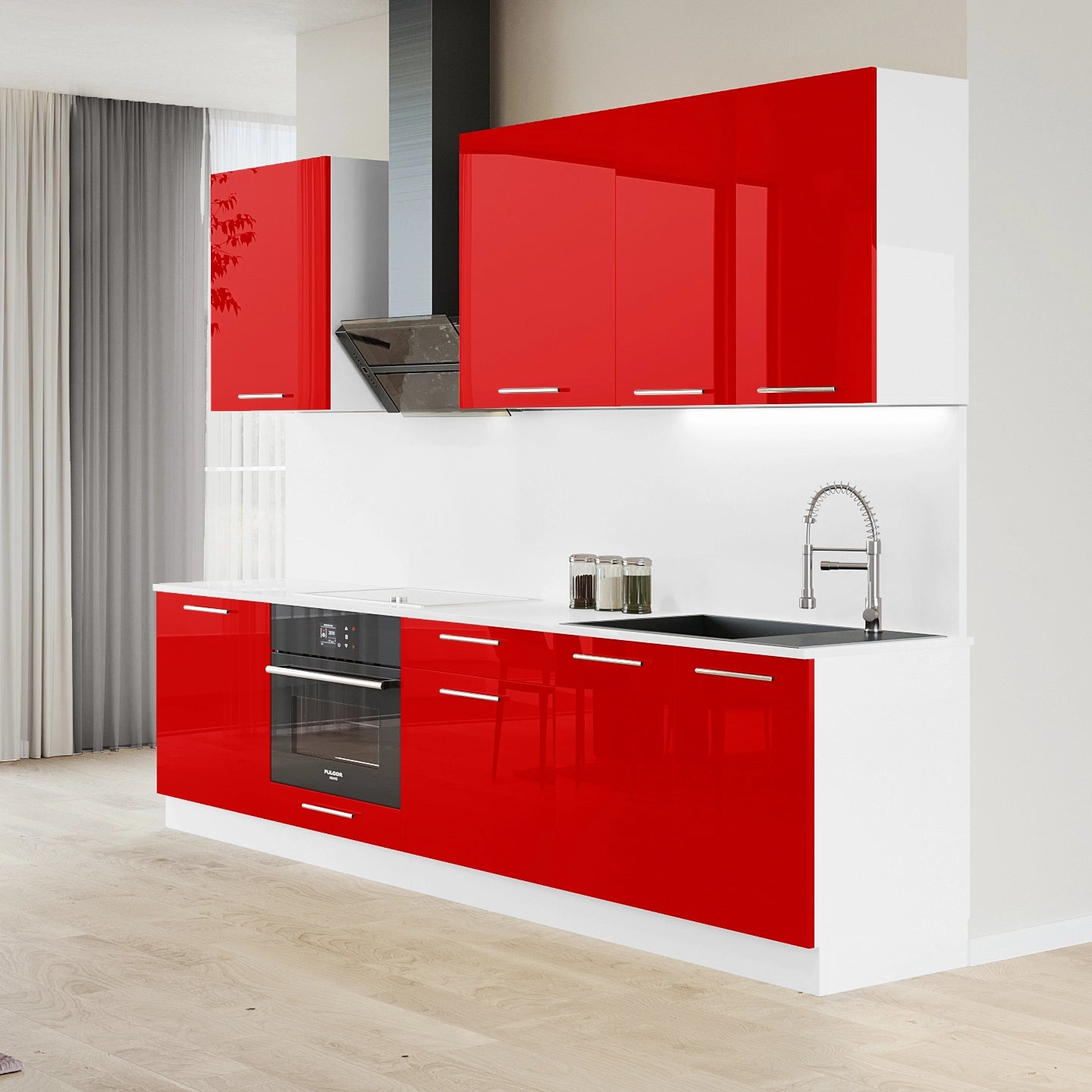 Cuisine complète haut et bas 260cm 7 meubles dont sous évier et bas four, façade laquée Rouge, Poignées inox et pieds fournis