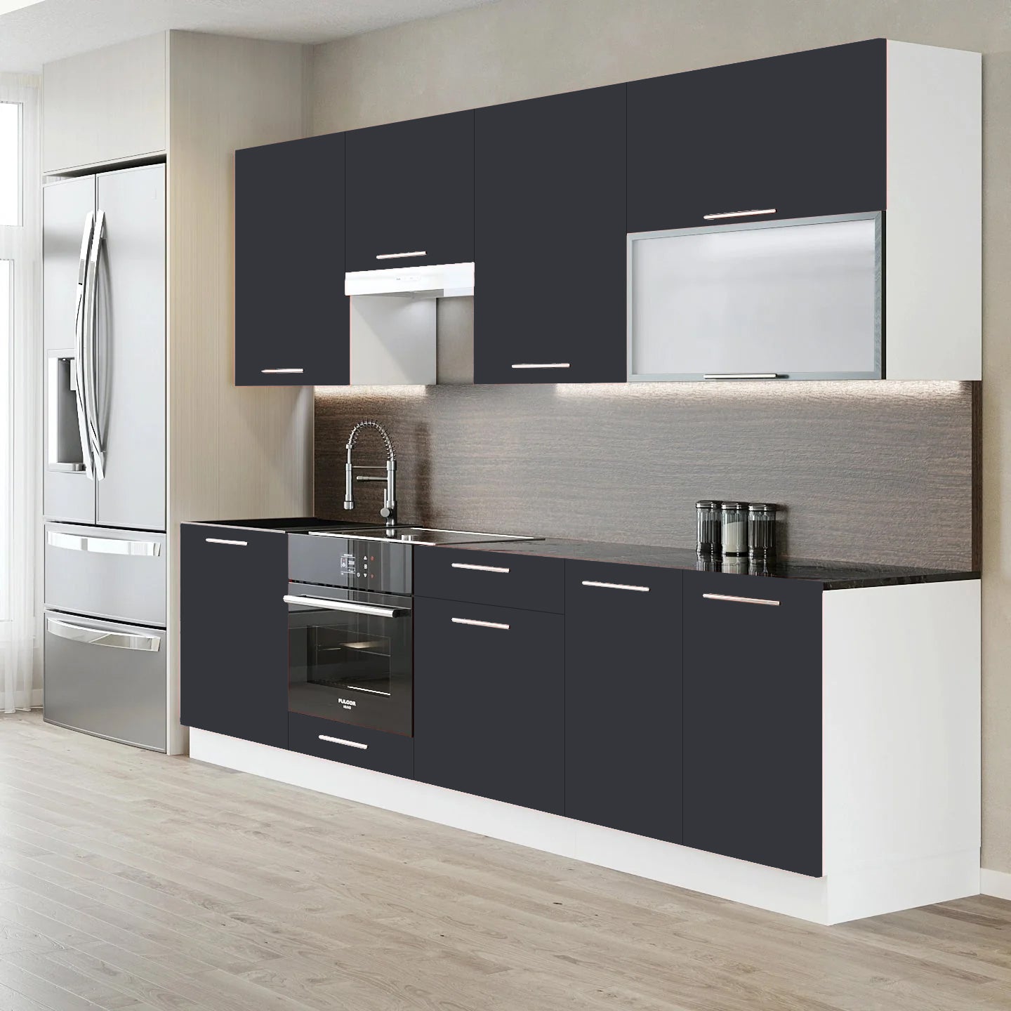 Offrez à votre espace cuisine une ambiance moderne avec cette cuisine complète 260 cm finition bois clair, comprenant 8 meubles haut et bas avec poignées inox et pieds réglables.
