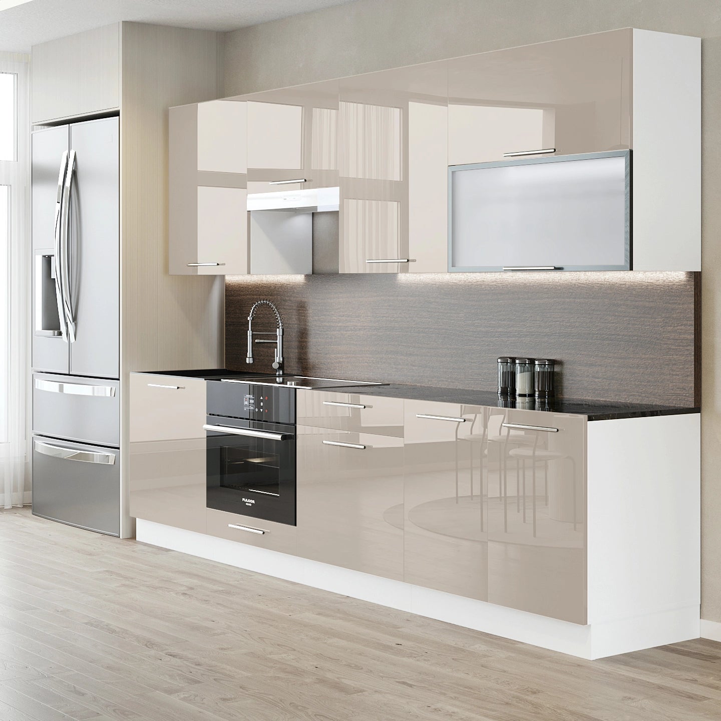 Cuisine complète haut et bas 260cm 8 meubles dont sous évier, façade laquée Beige, Poignées inox et pieds fournis
