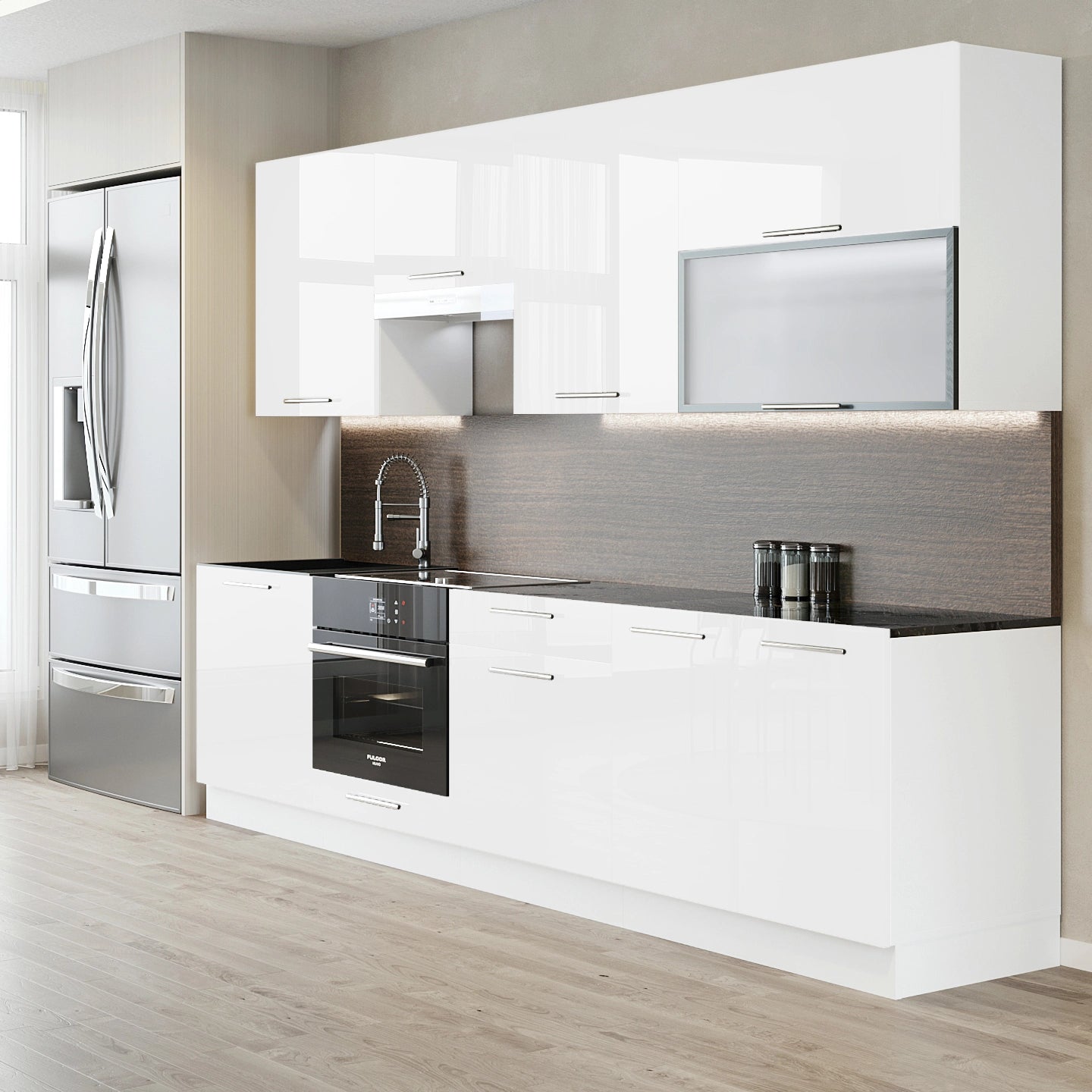Cuisine complète haut et bas 260cm 8 meubles dont sous évier, façade laquée Blanc, Poignées inox et pieds fournis