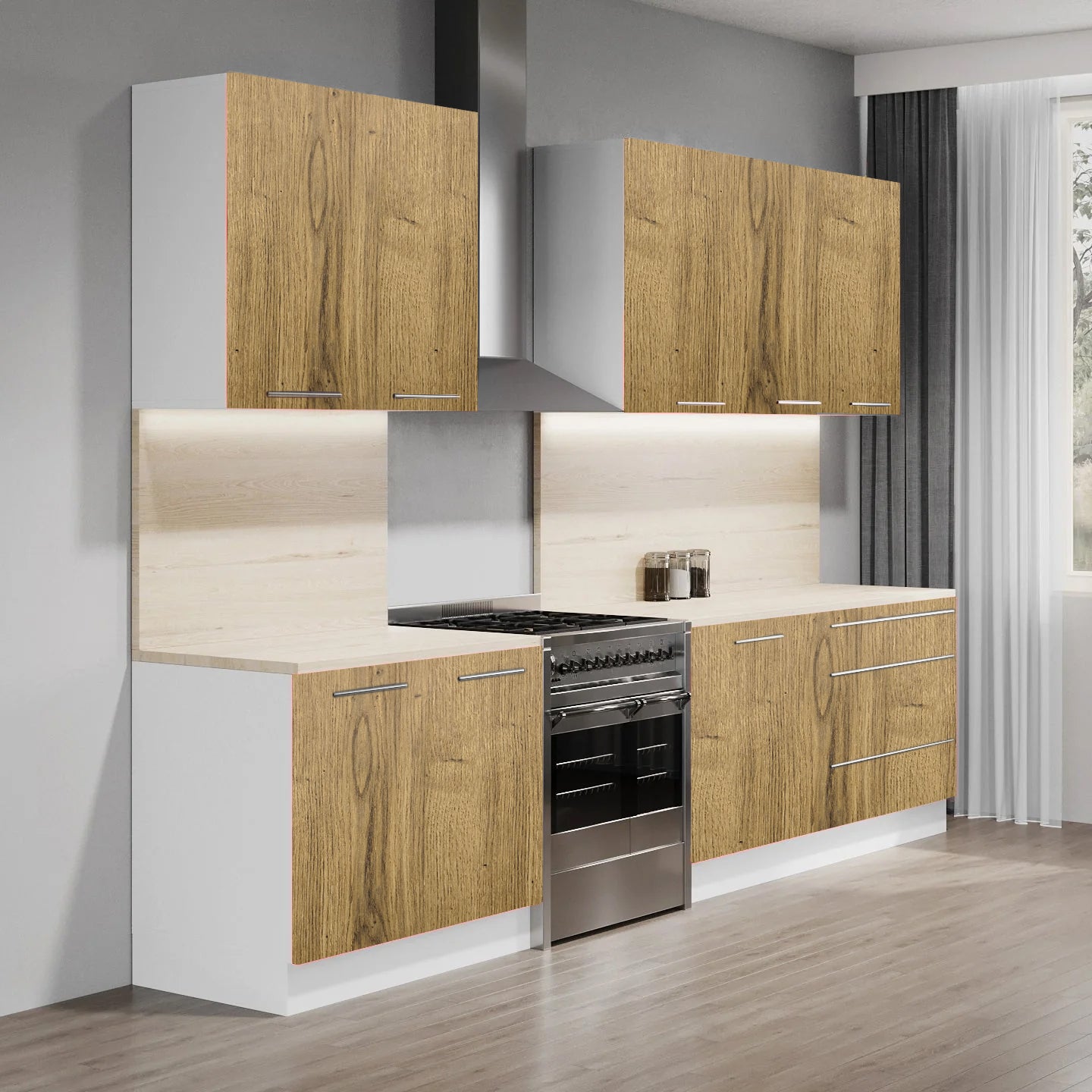 Optimisez votre espace avec cette cuisine complète 280 cm composée de 6 meubles hauts et bas, dont un meuble sous évier et un casserolier. Finition bois clair et poignées inox pour un style moderne et lumineux.