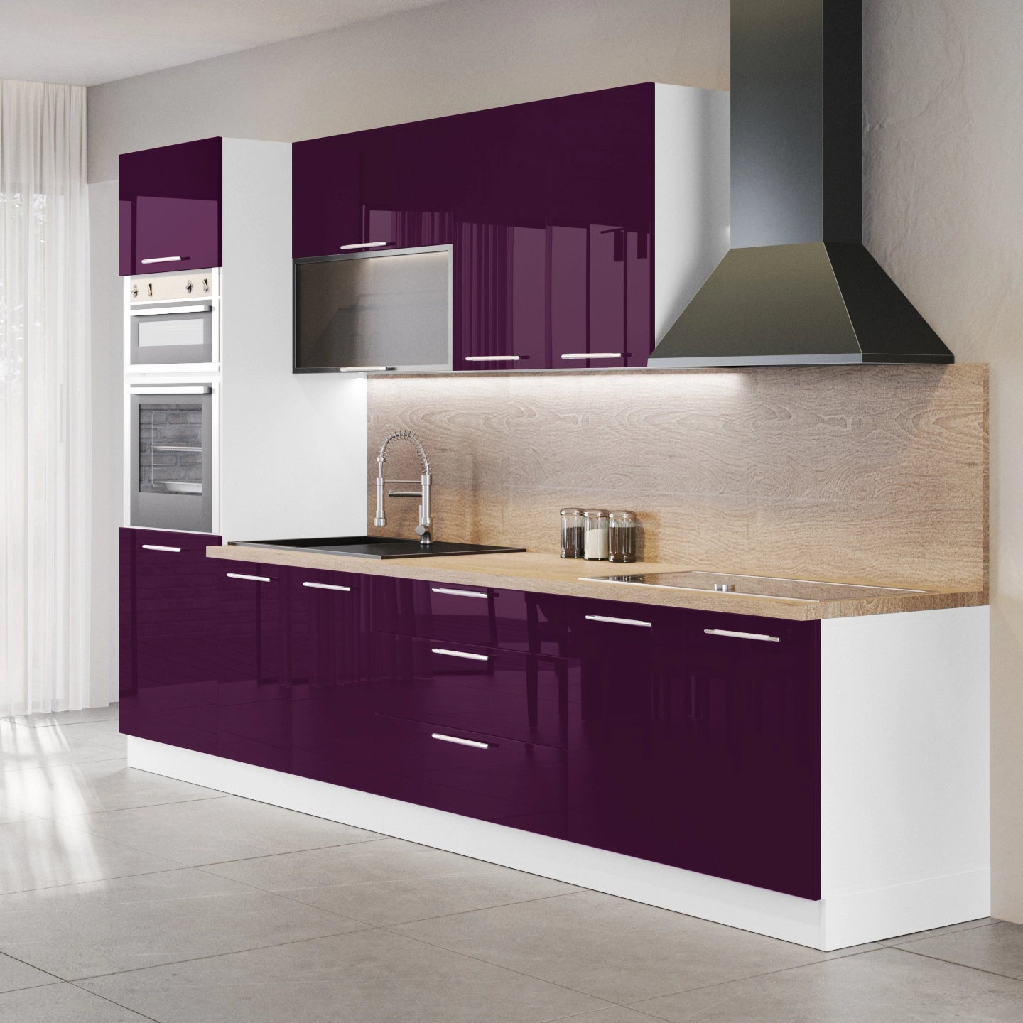 Cuisine complète haut et bas 300cm 6 meubles dont sous évier et colonne four, façade laquée aubergine, Poignées inox et pieds