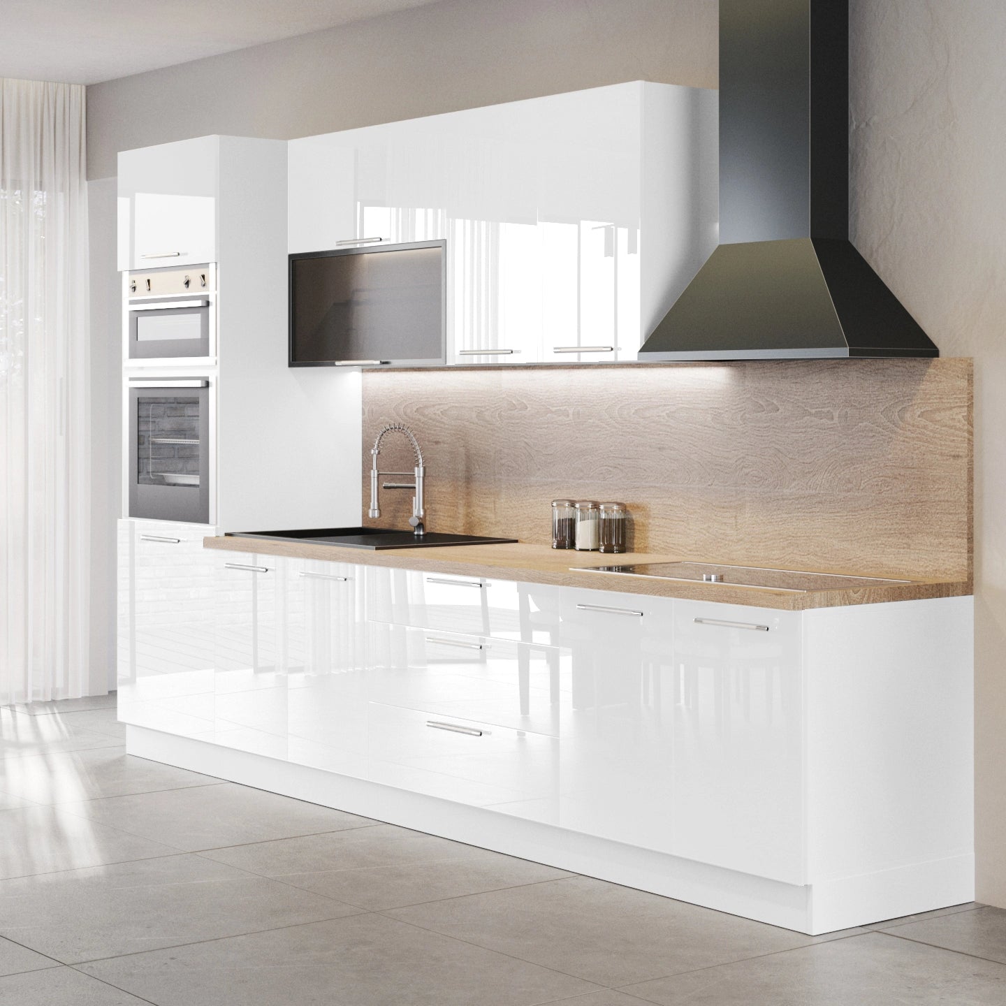 Cuisine complète haut et bas 300cm 6 meubles dont sous évier et colonne four, façade laquée blanche, Poignées inox et pieds fournis