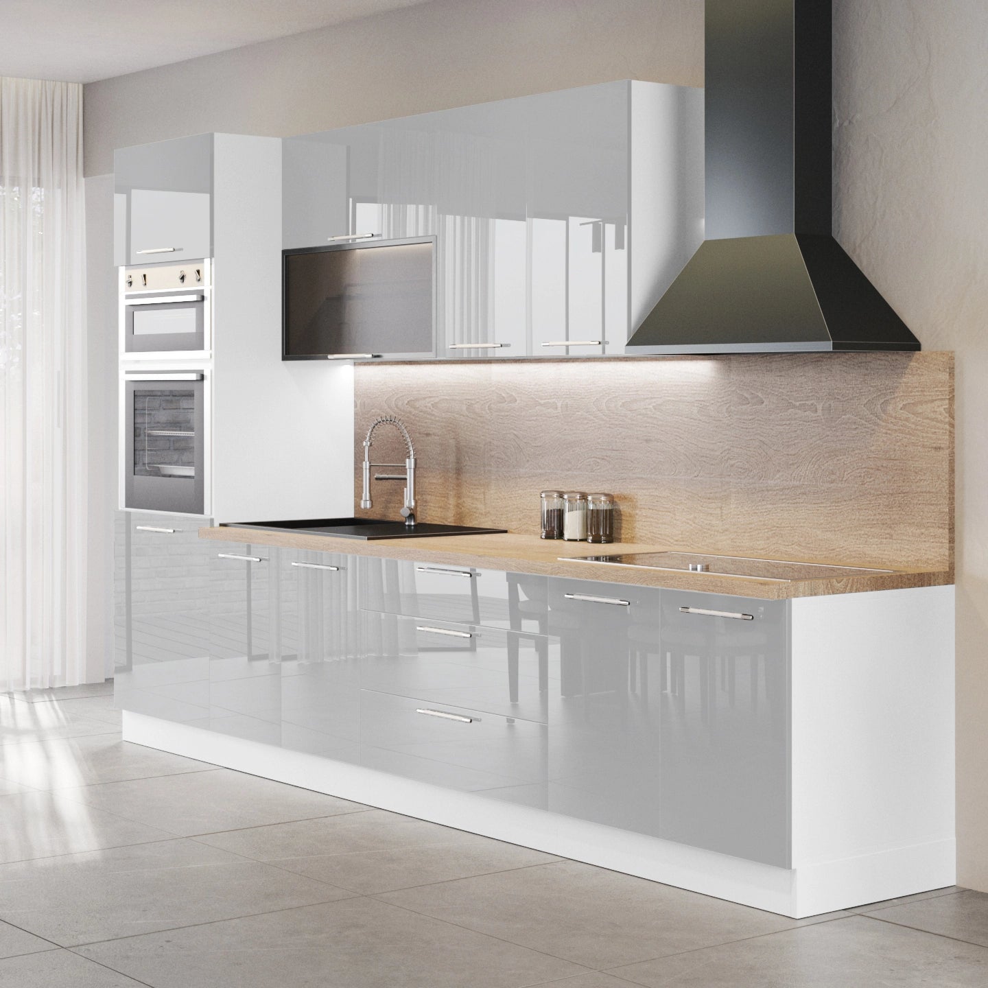 Cuisine complète haut et bas 300cm 6 meubles dont sous évier et colonne four, façade laquée grise, Poignées inox et pieds fournis