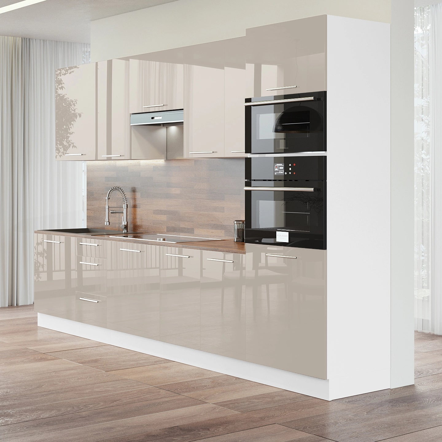 Cuisine complète haut et bas 300cm 9 meubles dont sous évier, sous hotte et colonne four, façade laquée beige, Poignées inox / pieds