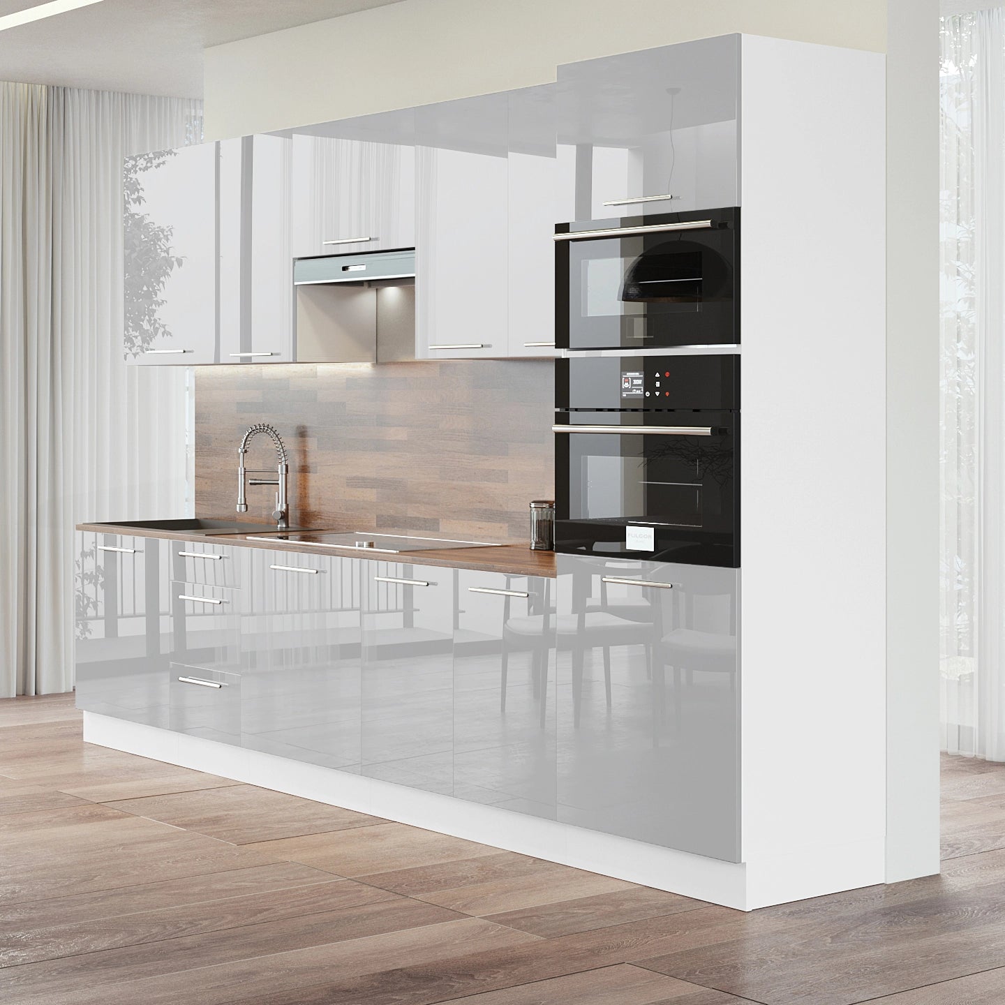 Cuisine complète haut et bas 300cm 9 meubles dont sous évier, sous hotte et colonne four, façade laquée grise, Poignées inox / pieds
