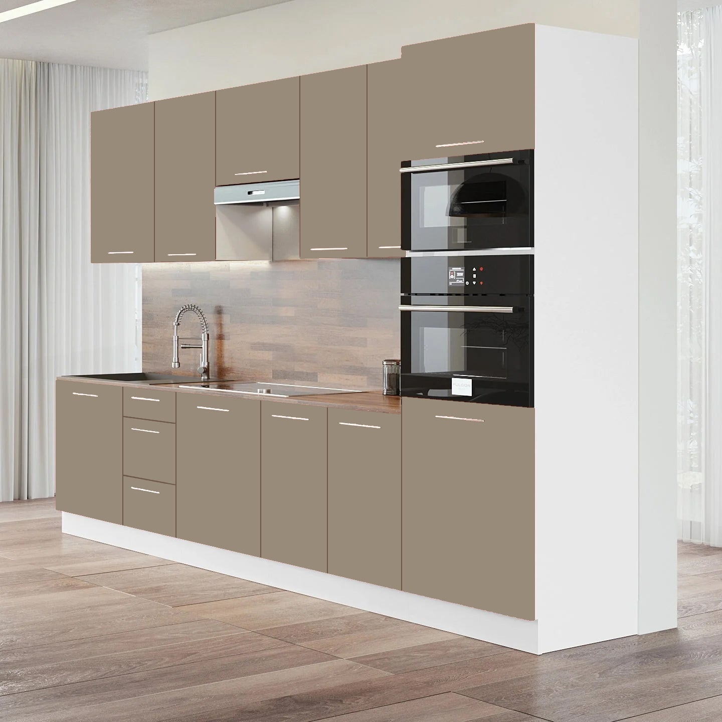 Transformez votre cuisine avec ce modèle complet 300 cm linéaires, composé de 9 meubles (haut et bas) avec façade sable mat, poignées inox et pieds réglables.