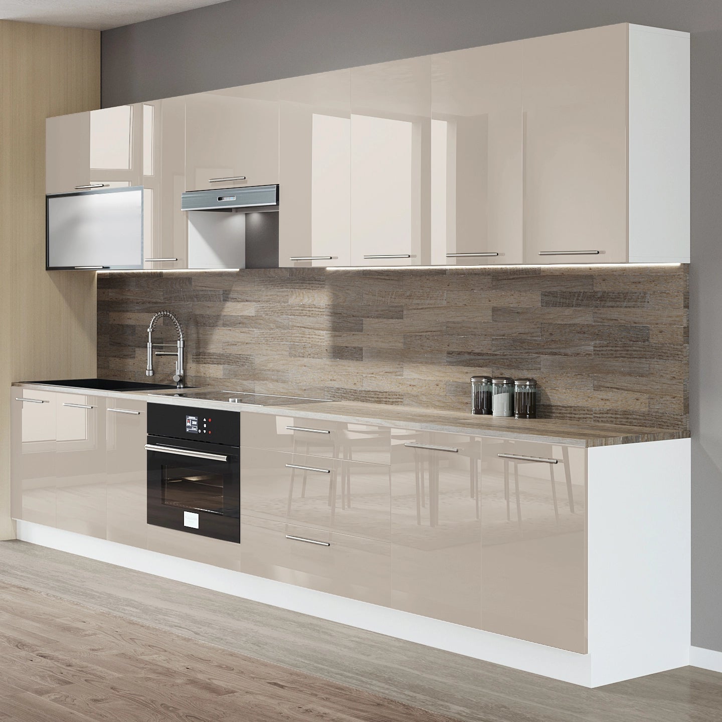 Cuisine complète haut et bas 330cm 10 meubles dont sous évier, bas four et sous hotte, façade laquée Beige, Poignées inox et pieds