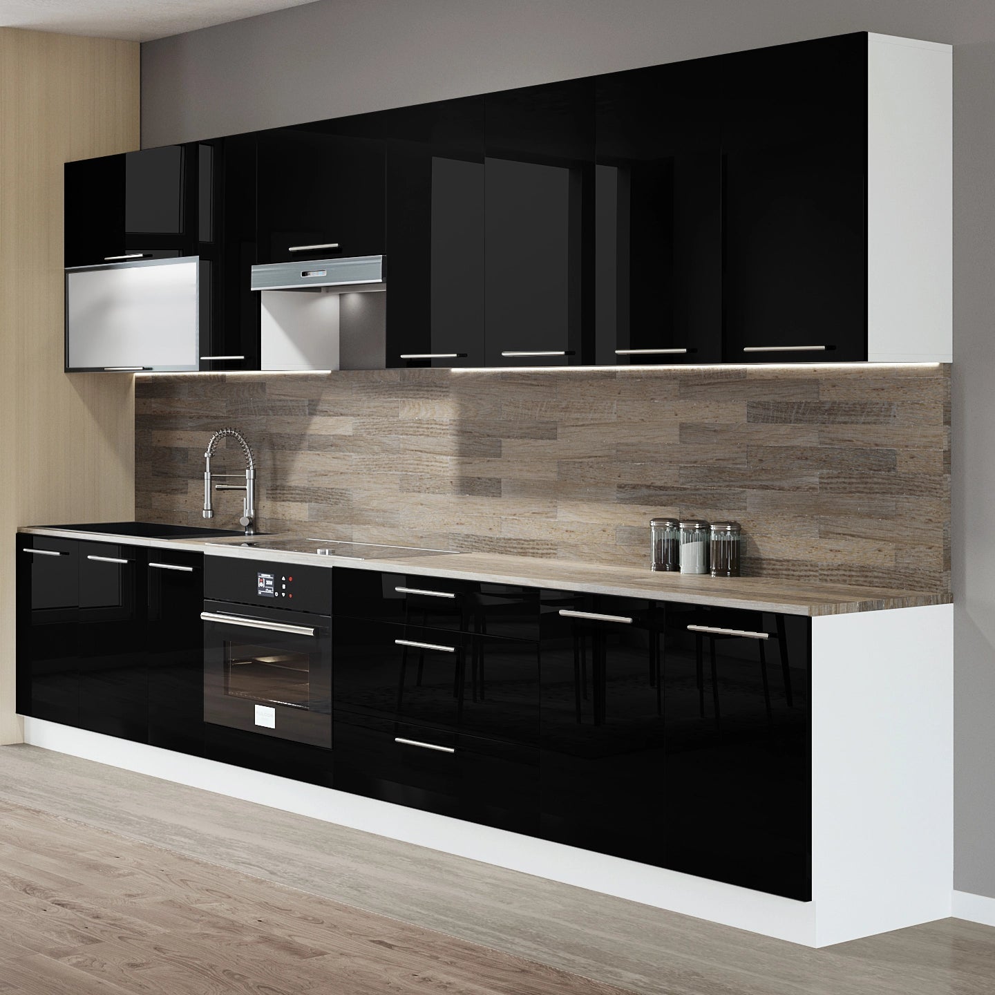 Cuisine complète haut et bas 330cm 10 meubles dont sous évier, bas four et sous hotte, façade laquée Noir, Poignées inox et pieds